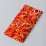 Chocolate blanco infusionado con Tajín, relleno de gel de mango y topping de mango confitado.