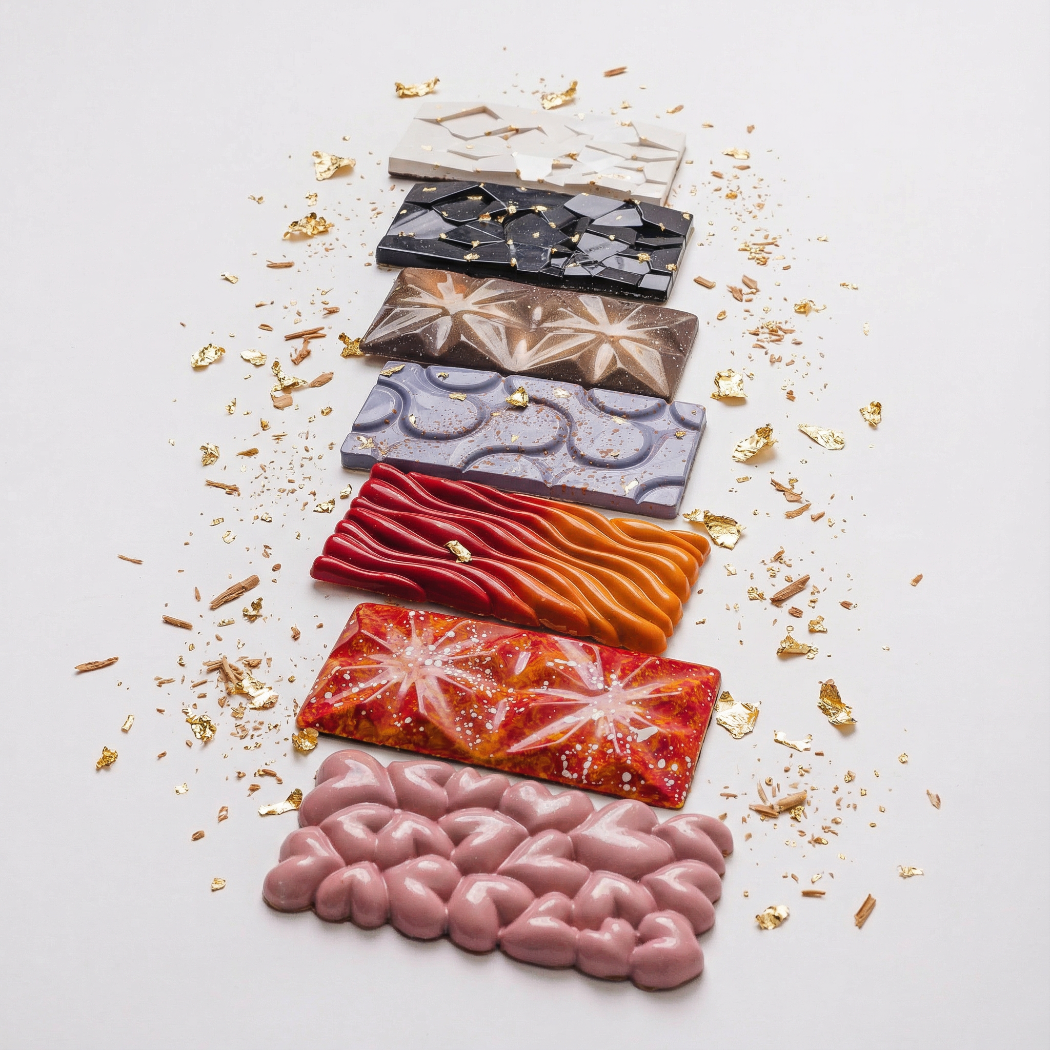 Inspirados en la arquitectura moderna, nuestros Lingotes son barras macizas esculpidas con precisión. Cada barra esconde un interior de texturas complejas: pralinés crujientes, ganaches de origen único y geles de fruta natural, todo bajo una capa geométrica perfecta.